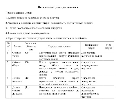 Определение размеров человека для построения чертежа основы прямой юбки (7 класс)